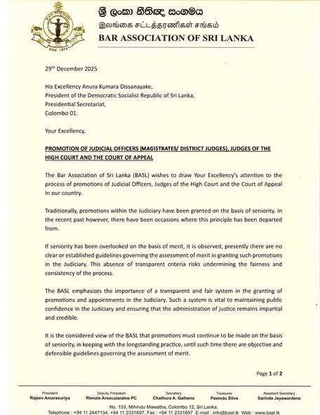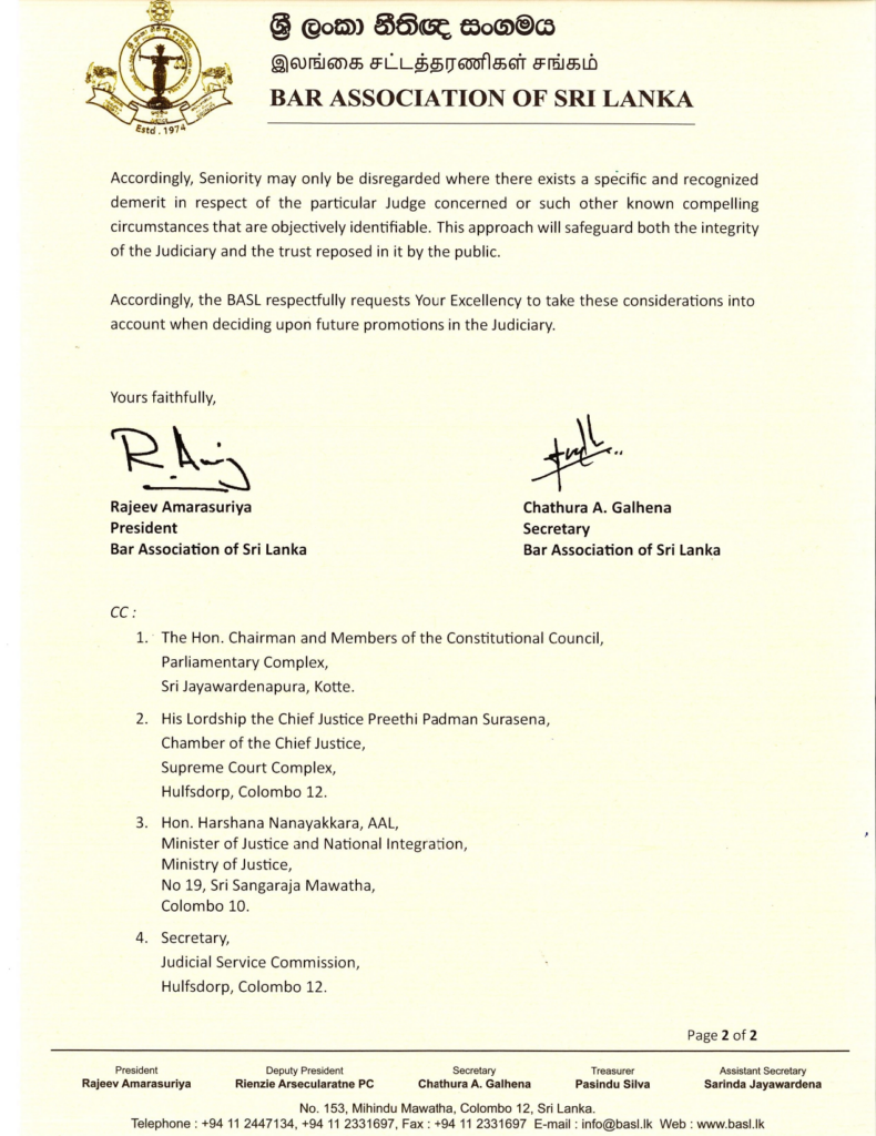 BASL Letter to HE the President on Promotion of Judicial Officers, Judges of the High Court & Court of Appeal