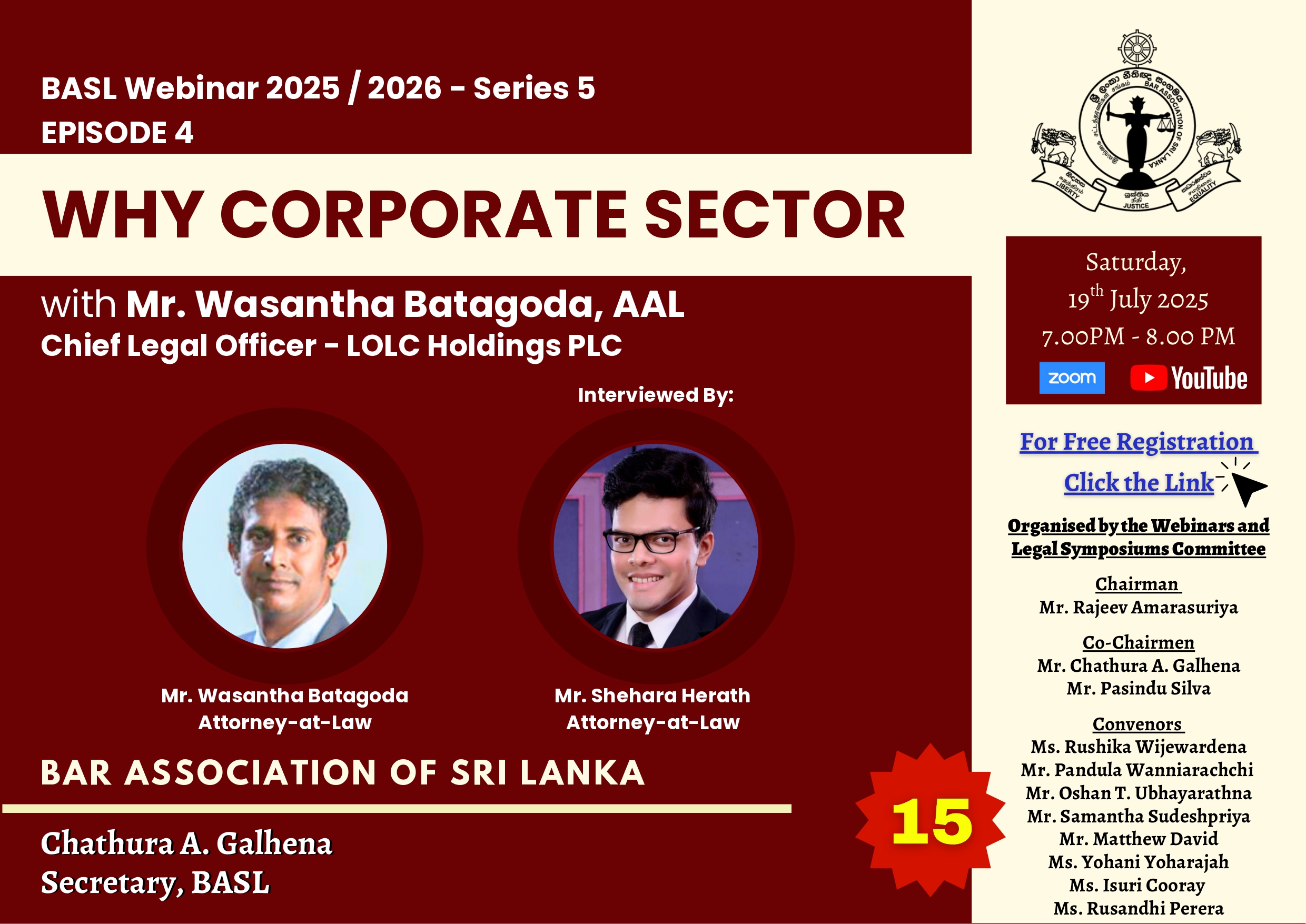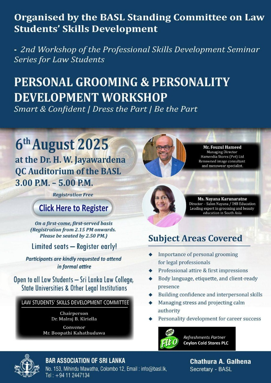 නීති තීර්ථ (Neethi Theertha) is a new series of 20 Sessions for Law Students of the Faculty of Law of the University of Colombo, organised with the support of the BASL. The first session will be conducted by BASL President Mr. Rajeev Amarasuriya. ...