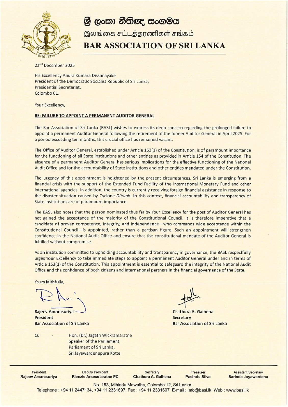 24 Dec BASL Letter to HE The President on appointment of Civil Society Representetives to Constitutional Council ... December 24, 2025 0 Latest News, News