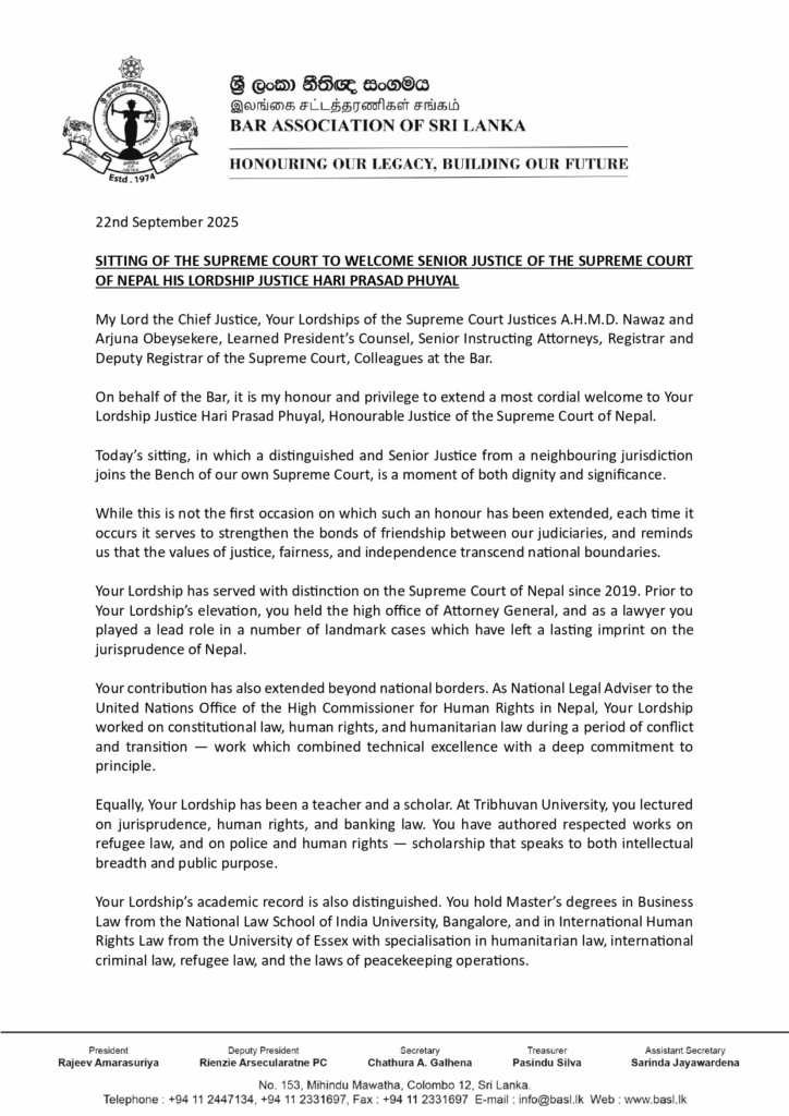 The following is the Address of BASL President Mr. Rajeev Amarasuriya welcoming Justice Phuyal before the Supreme Court :-
