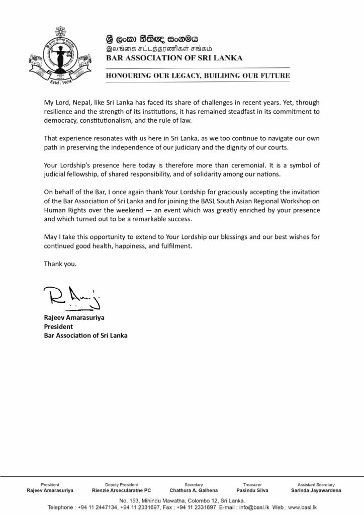 The following is the Address of BASL President Mr. Rajeev Amarasuriya welcoming Justice Phuyal before the Supreme Court :-